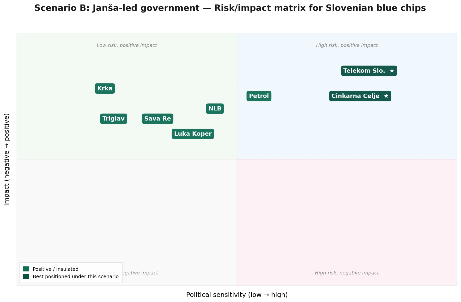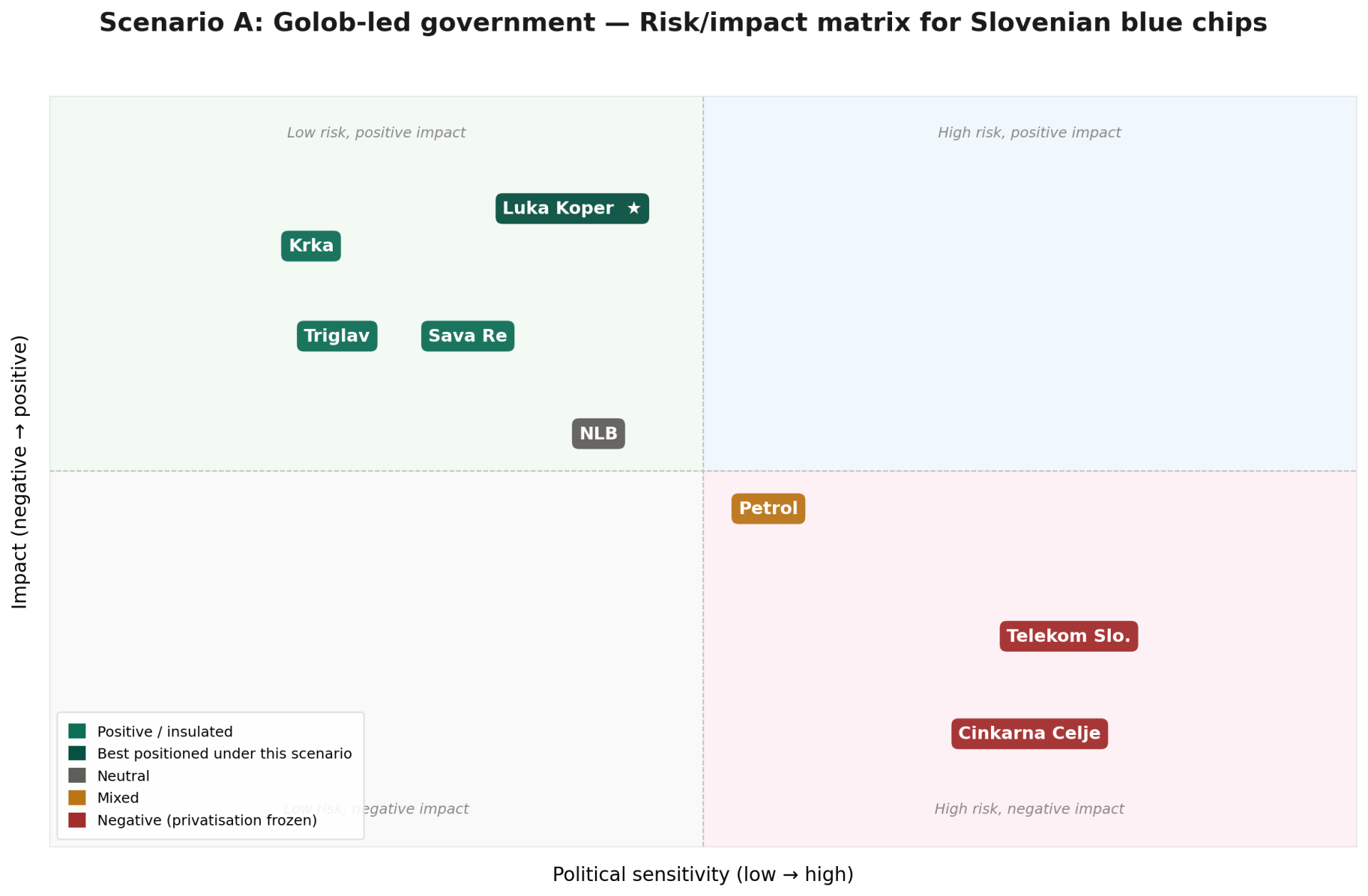 For Krka, like with the GS-led government, the impact is mostly neutral. It could benefit from the possible tax reform under SDS, as well as improvements to SDH governance. In general, however, it still remains mostly disconnected from political changes in the country. Likewise, the 2 insurers, Triglav and Sava Re, could marginally benefit from better SDH governance, although we do not expect any major changes as to how it was set up until this point. Lastly, Cinkarna Celje’s case is similar to Telekom Slovenije. As it’s in an even better position, privatization-wise, the sale of the 24.44% stake could occur quickly, marking a win for the SDS’s pro-privatization mandate. A trade or a secondary offering would reduce political overhang and could attract strategic or financial buyers interested in the Company’s operations.