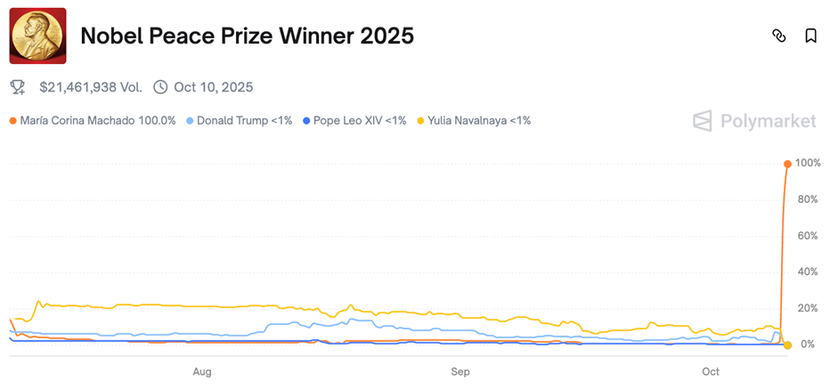 Examples in the stock market are numerous as well, but not only there, it almost seems like you can find an unusually large trade fill before any big announcement on anything these days. Event betting sites like Polymarket have been growing popularity this year, and the same patterns are emerging there as well. Before the recent Nobel peace prize winner announcement, Maria Corina Machado had negligible odds of winning right up to the announcement day, when someone started betting big on her win. This has caught the eye of Norwegian officials who oversee the Nobel peace prize and have started an investigation on the event.