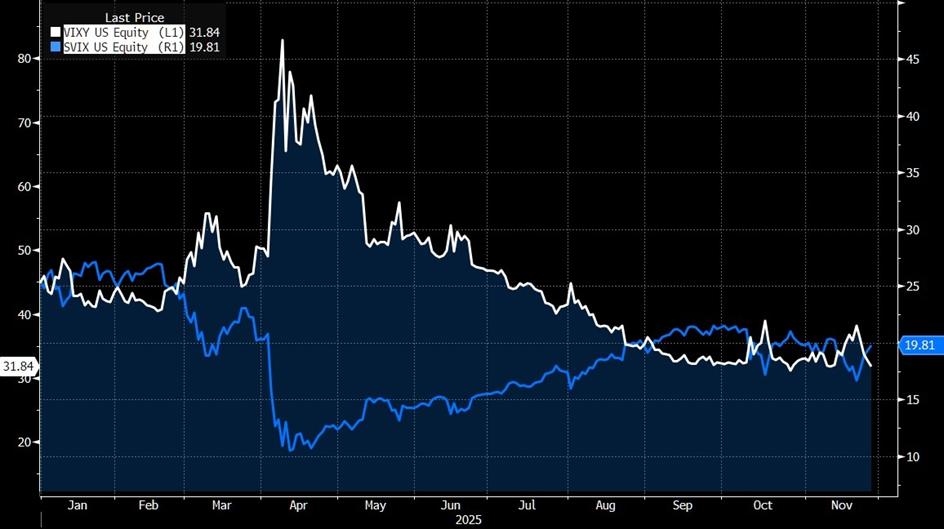 A real-world example that illustrates the complexity of trading or investing in VIX products is the performance of long and short VIX ETFs. Since the start of 2025, both ETFs have posted negative returns, a clear reminder that volatility products are far from straightforward.
