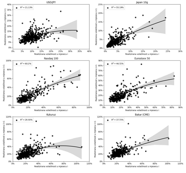 We then show that clustering does not hinge on the asset class. The same behavior appears across equities (indices and single names), commodities, currencies, and fixed income. As the commodity example above illustrates, a simple takeaway is that, in many cases, the best estimate of near‑term realized volatility is the level observed in the recent past. We show that in the following graph, where the y-axis shows how realized volatility in month t+1 depends on the realized volatility in month t. Each panel also reports the coefficient of determination (R²) from a second‑degree polynomial fit.