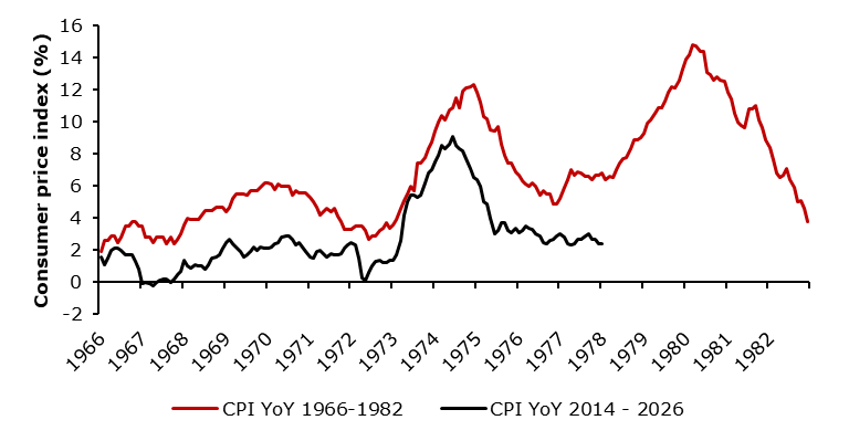 US CPI indices YoY change comparison (1996 – 1982 and 2014 – 2026, %)